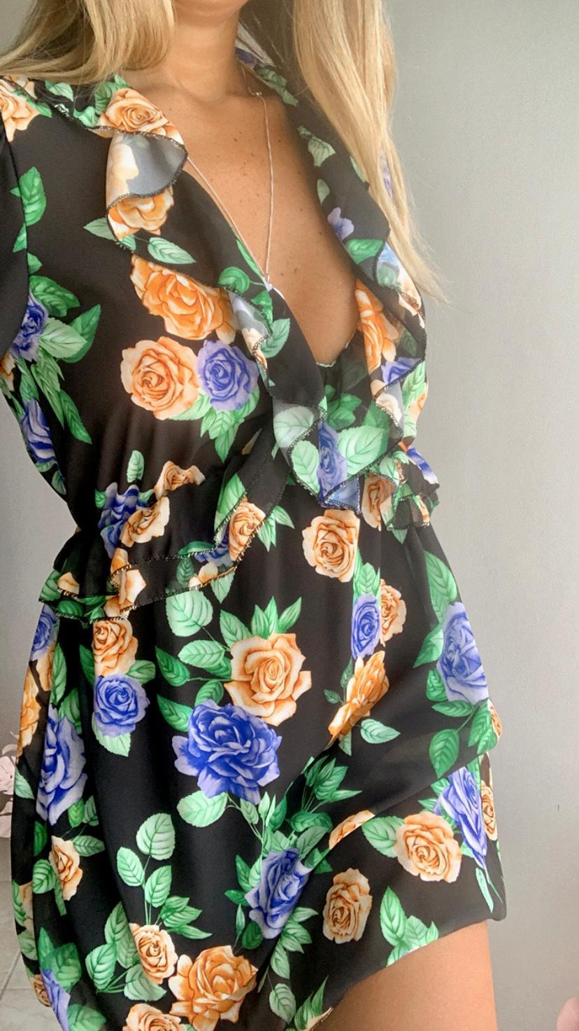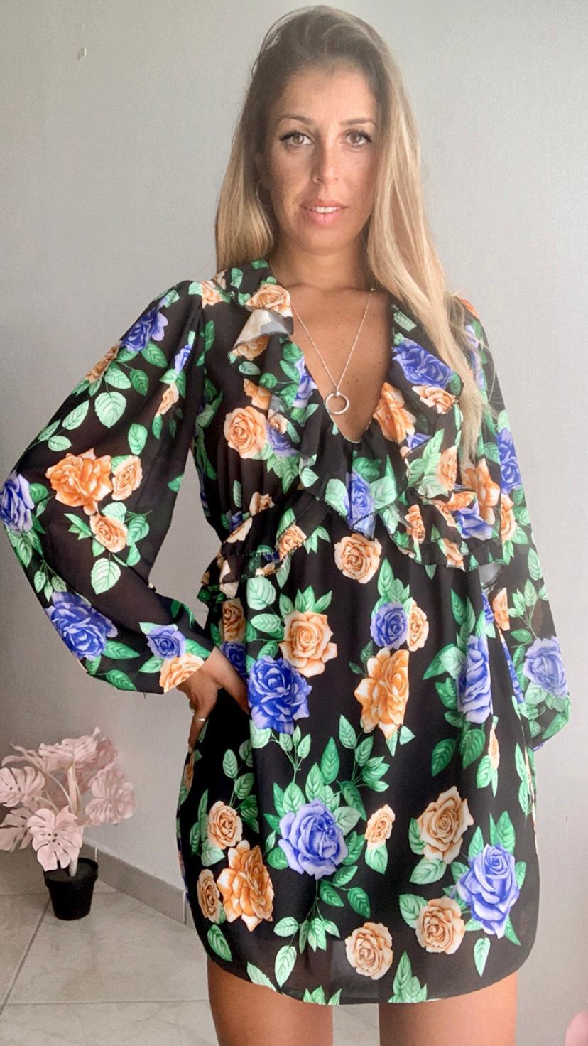 Abito in tulle, fantasia fondo nero con fiori colorati, manica lunga con polsino con bottone, scollo a V con vol, taglio in vita con elastico, gonna mini morbida.