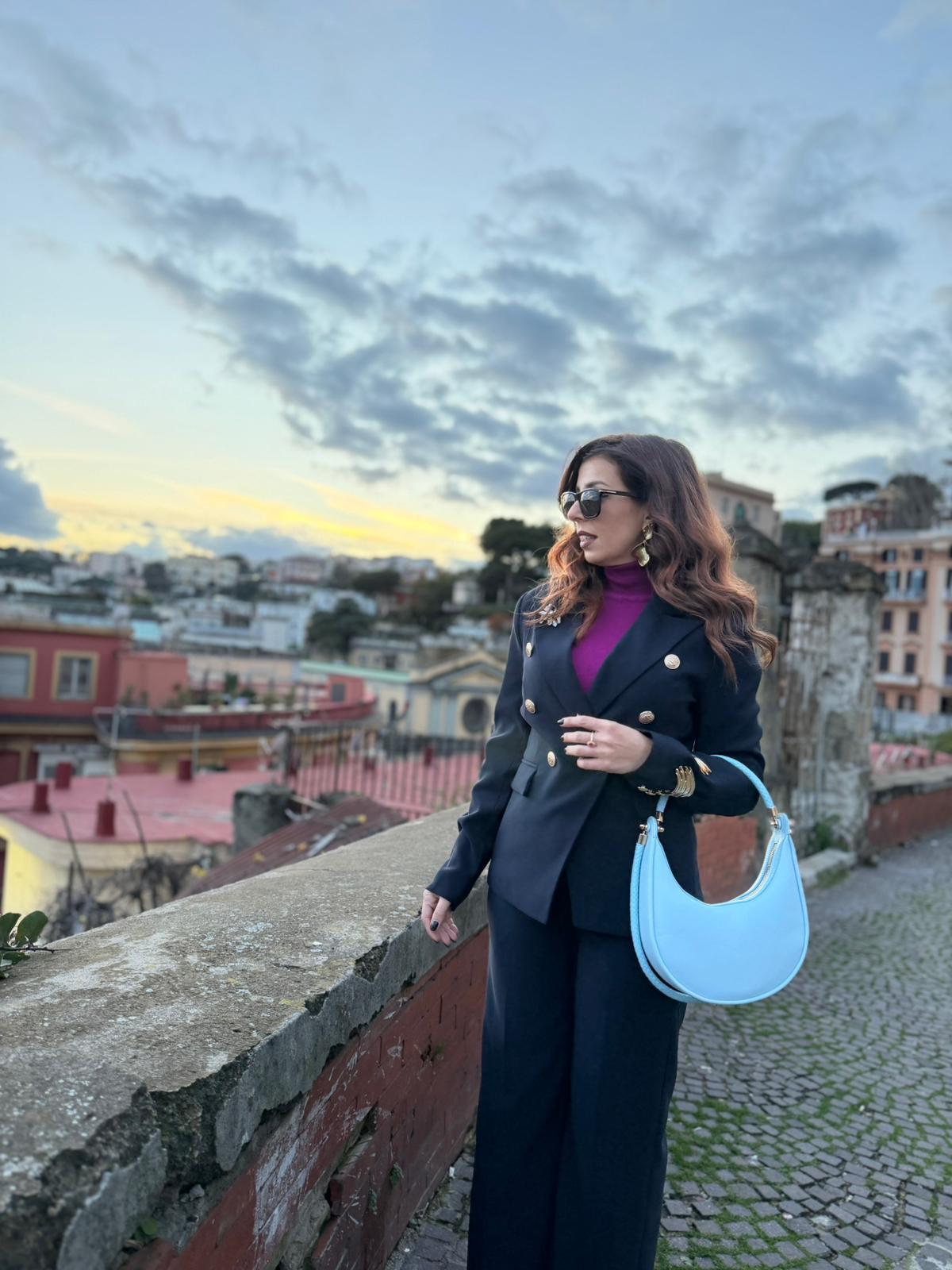 "Tailleur oversize Mira: blazer e pantalone portabilissimi anche separati. Perfetto in ufficio con sneakers bianche, zero pieghe a fine giornata."