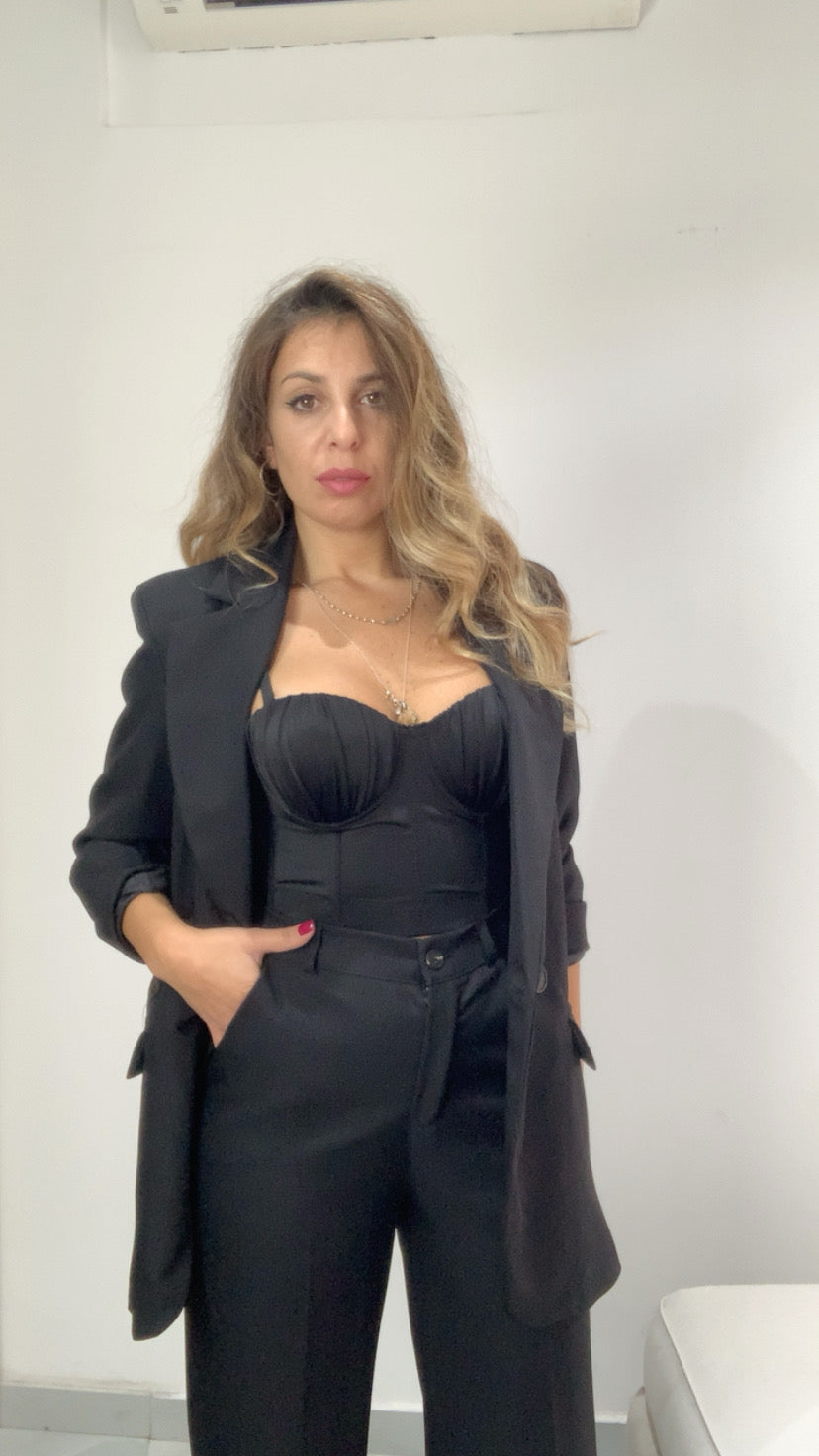 "Tailleur oversize Mira: blazer e pantalone portabilissimi anche separati. Perfetto in ufficio con sneakers bianche, zero pieghe a fine giornata."