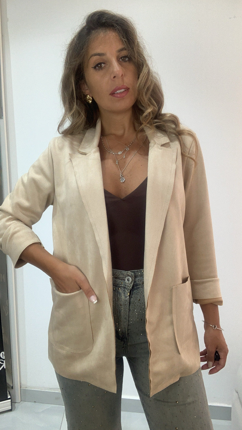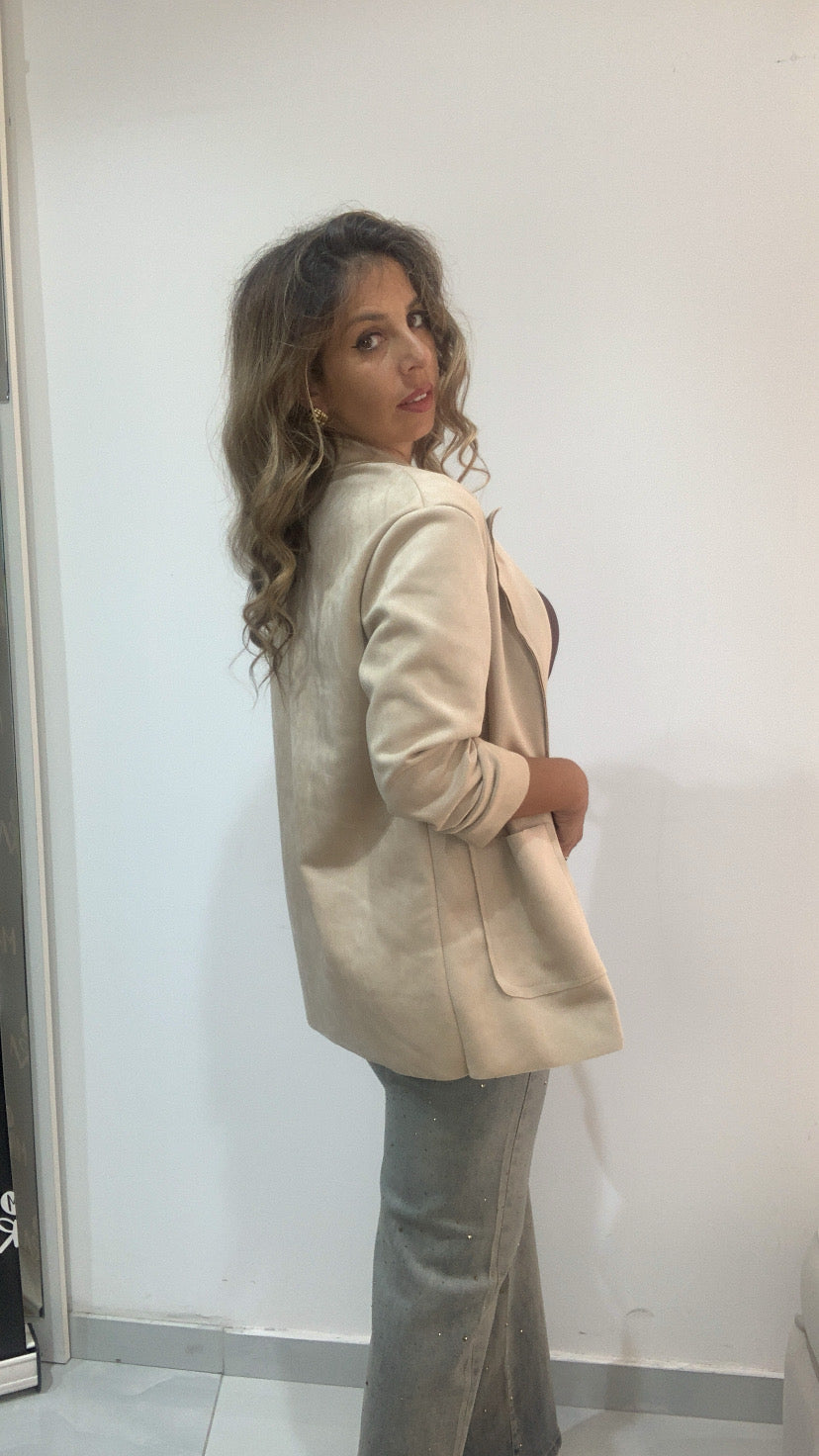 Giacca da donna in morbido camoscio sintetico, dal taglio pulito e senza abbottonatura, perfetta per uno stile casual ma curato. Modello aperto, con tasche frontali pratiche e vestibilità comoda. Lunghezza ai fianchi, ideale da abbinare sia a jeans che a pantaloni eleganti per un look versatile e di tendenza. vestibilità da S a XL.