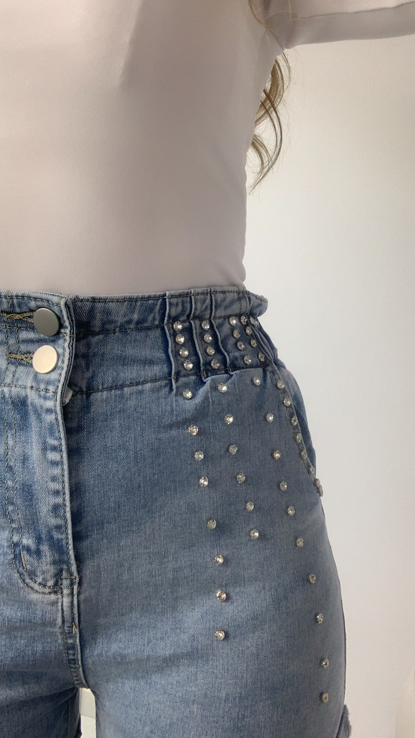 Short in jeans, vita alta con elastico in vita effetto caramella, cinque tasche, chiusura con zip e doppio bottone, tessuto stretch, applicazioni strass sul davanti, effetto push up sul retro.