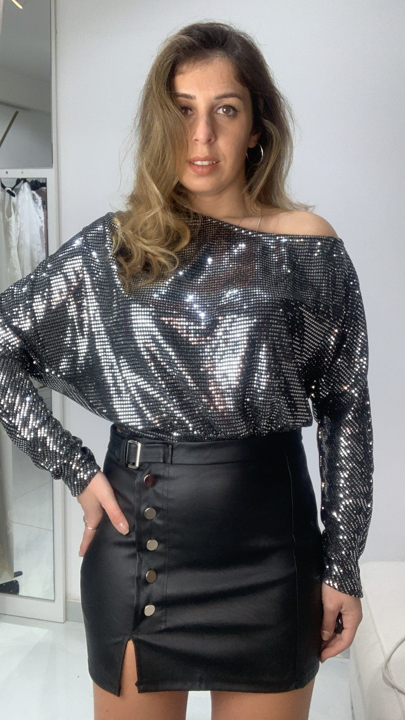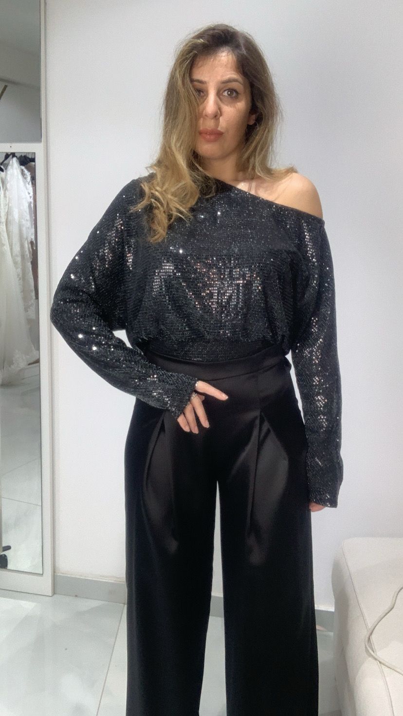 Maglia manica lunga con elastico sul fondo, scollo a barca, ricoperta di paillettes, vestibilità S M L XL.