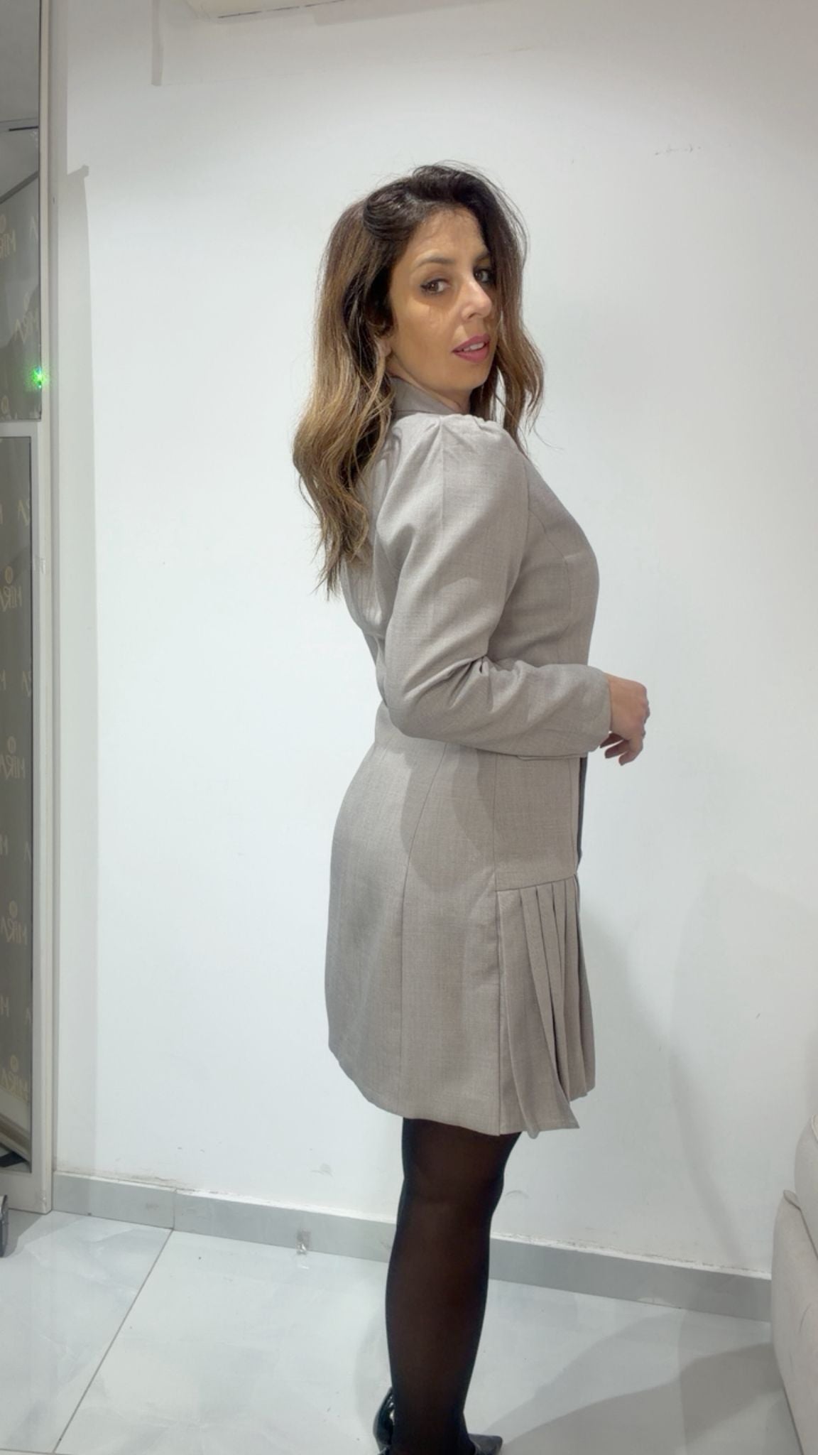 Abito giacca monopetto con spalline e tasche, chiusura con bottoni al centro, manica lunga, lunghezza fino al ginocchio, particolarità gonna asimmetrica e balze, modello aderente, vestibilità da S a L