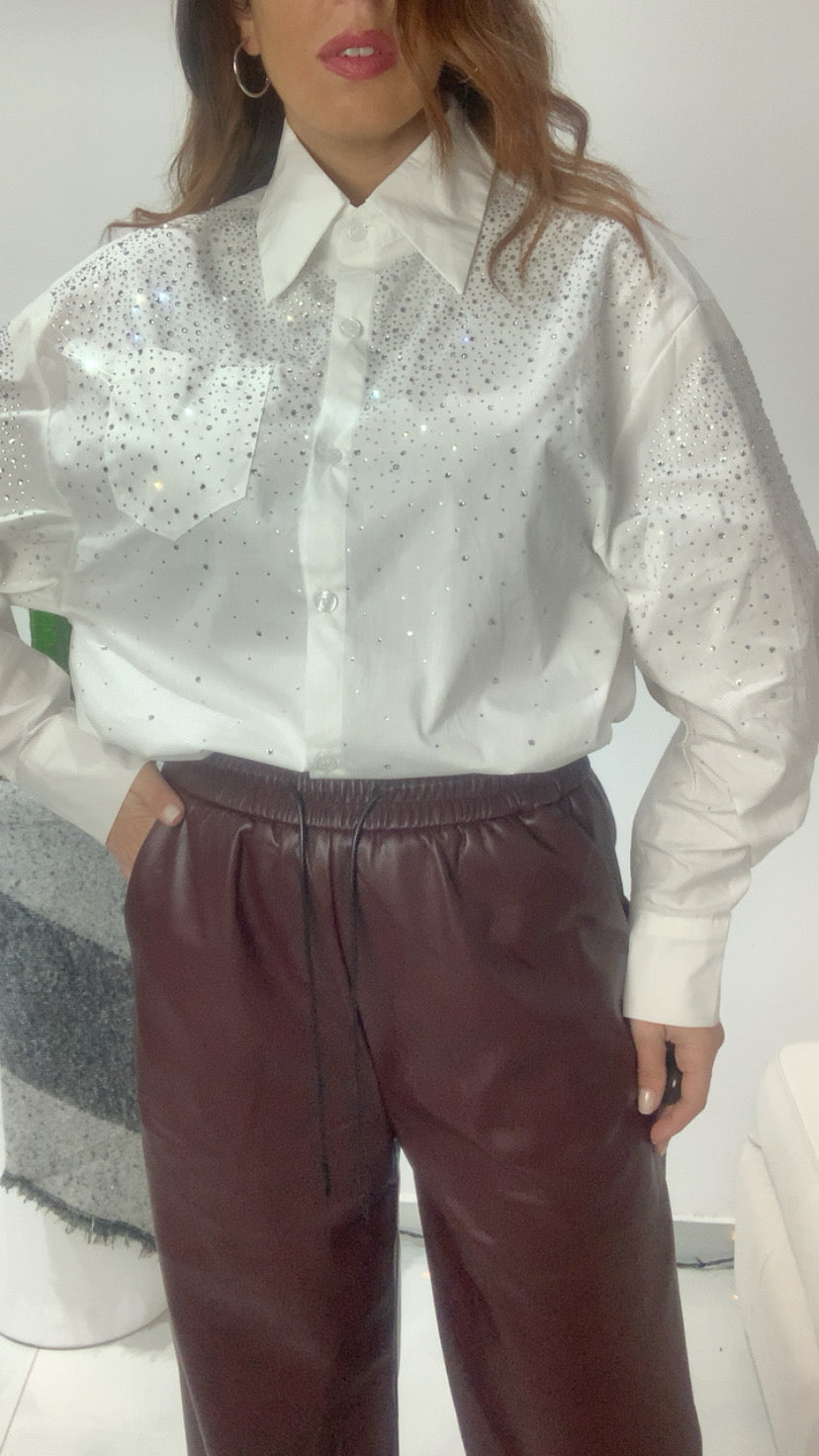 Camicia in cotone, modello oversize, manica lunga, asimmetrica, piu corta avanti e piu lunga dietro, taglio spalla basso, ricoperta di strass sul davanti e sulle maniche, vestibilità da S a XXXL