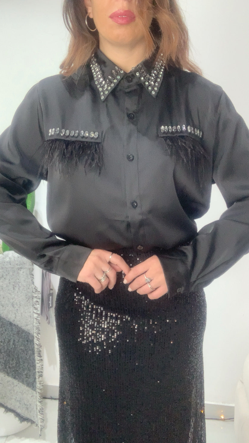 Camicia in cotone, manica lunga, chiusura con bottoni sul davanti, particolarità applicazioni di strass sul colletto e sui taschini, arricchito di piume, lunghezza ai fianchi, vestibilità morbida.