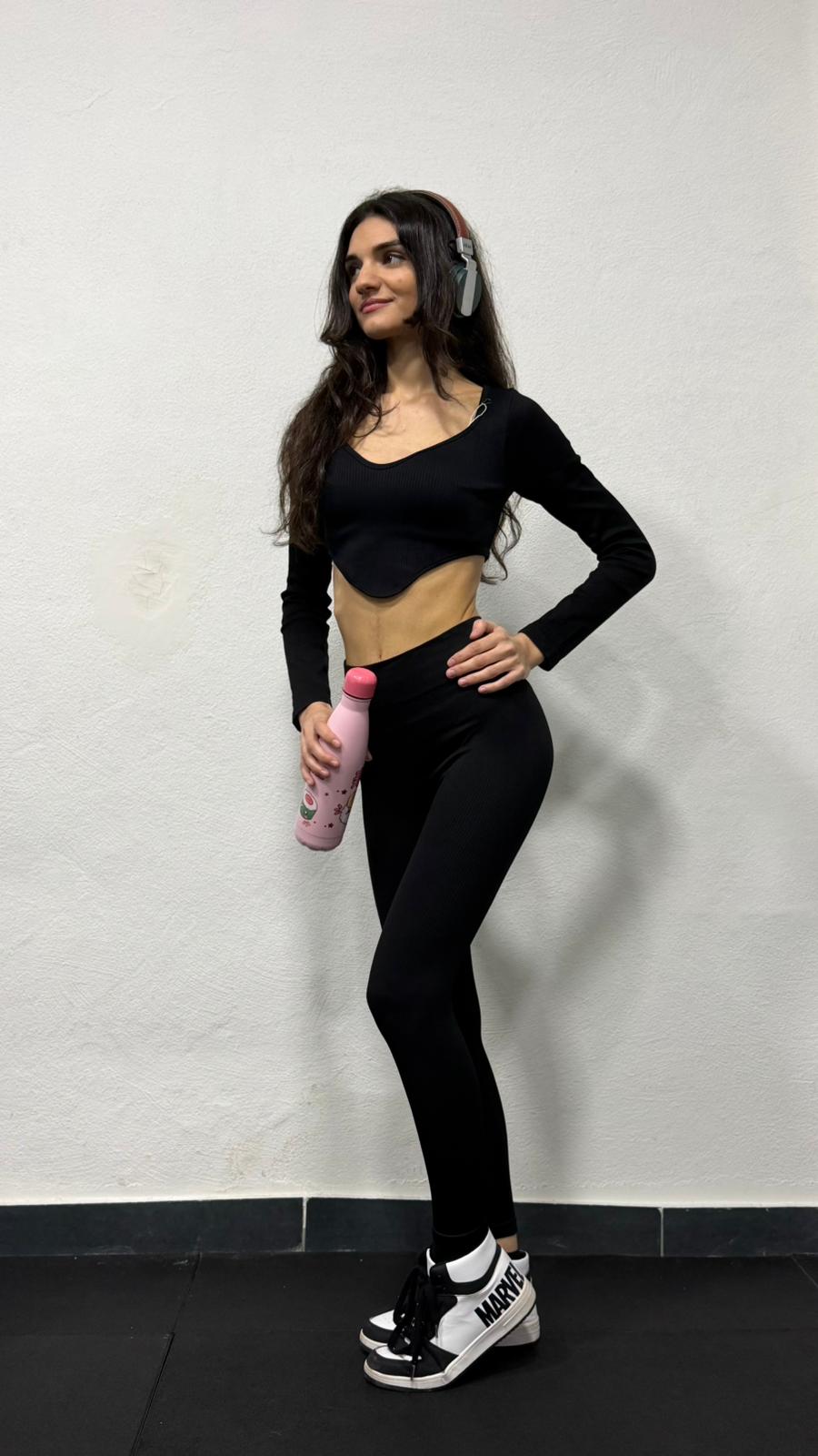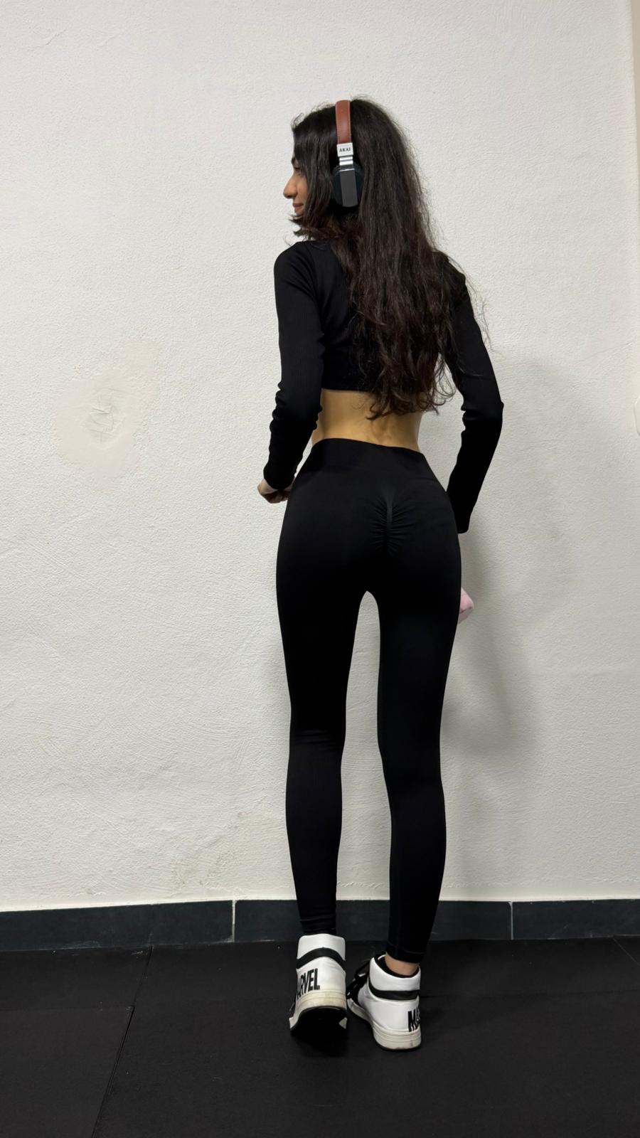Coordinato sportivo a costine composto da maglia crop manica lunga, scollo a v e leggings vita alta con drappeggio sul retro effetto push up.