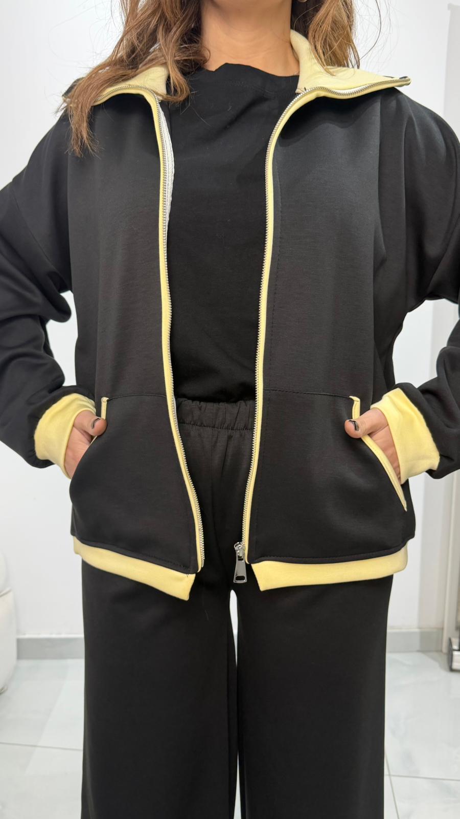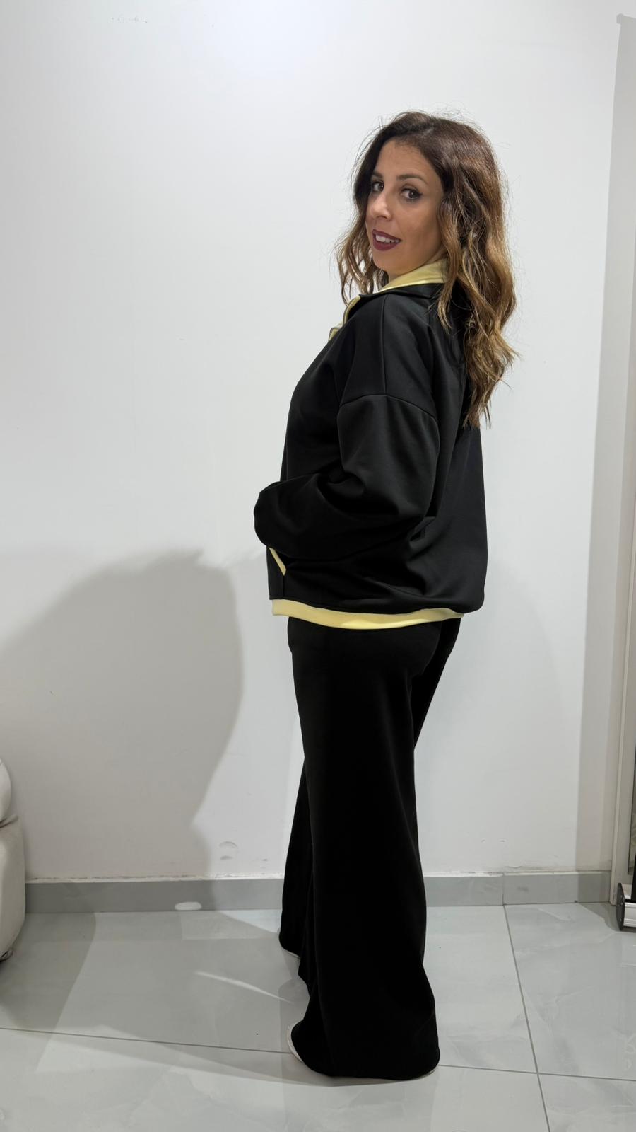 Coordinato tuta in viscosa, morbido e caldo, modello oversize, bicolor, composta da pantalone con elastico in vita e felpa con inserti giallo pastello, chiusura con zip e tasche, vestibilità da S a XL
