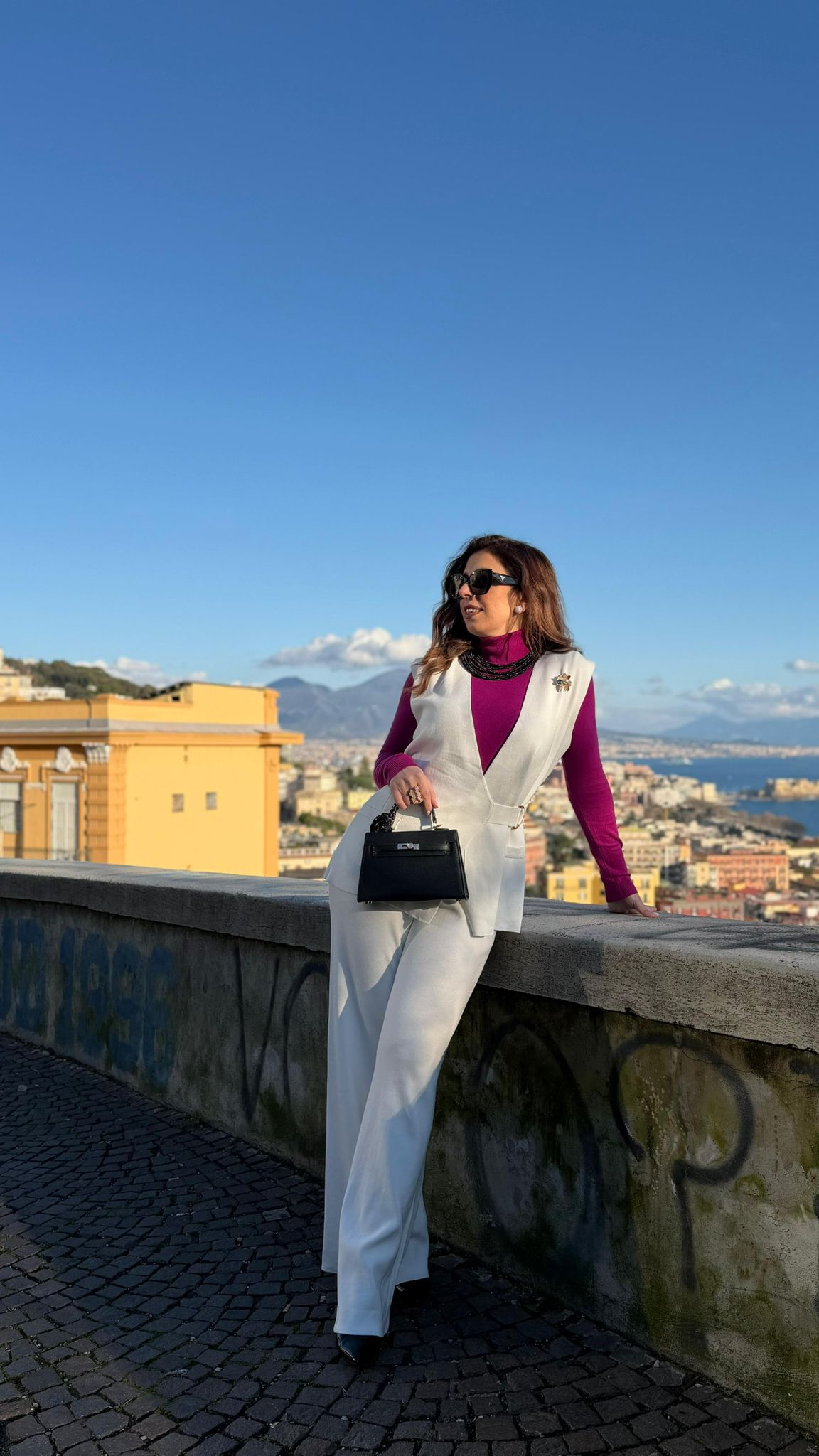 Coordinato in viscosa composto da pantalone a palazzo con vita alta ed elastico, incrociatina a giromanica con cintura in vita e dettaglio dorato,modello oversize, vestibilità da S a XL.