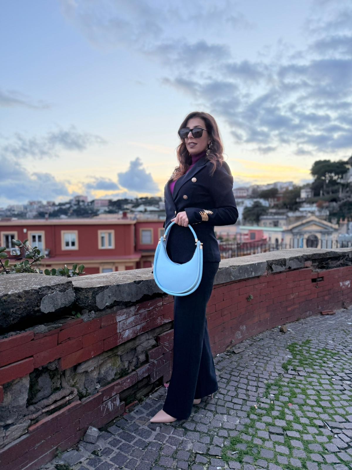 "Tailleur oversize Mira: blazer e pantalone portabilissimi anche separati. Perfetto in ufficio con sneakers bianche, zero pieghe a fine giornata."