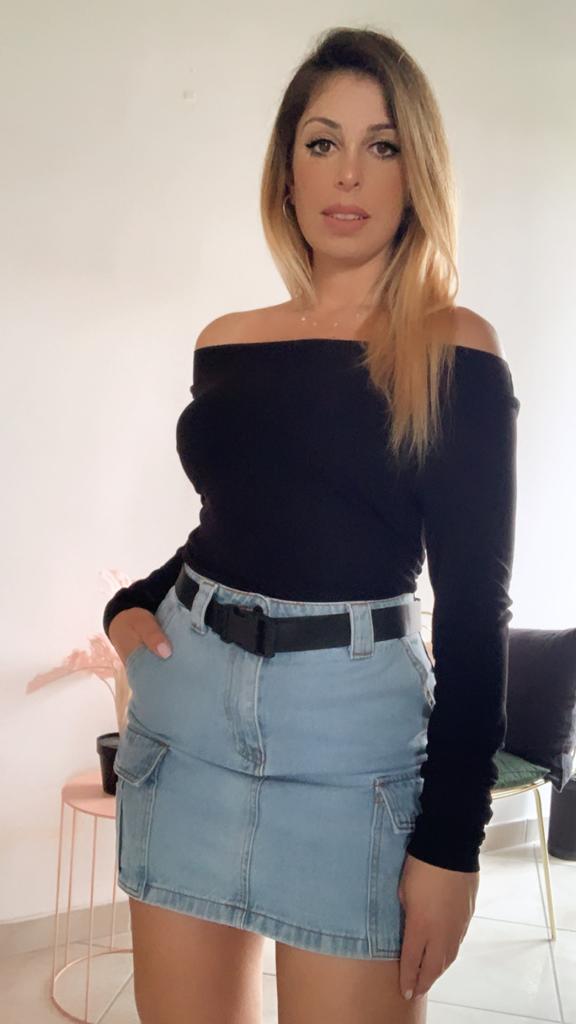 Gonna di jeans da donna con tasconi laterali modello cargo, tasche a filo, chiusura con zip e bottone, cintura a scatto nera coordinata