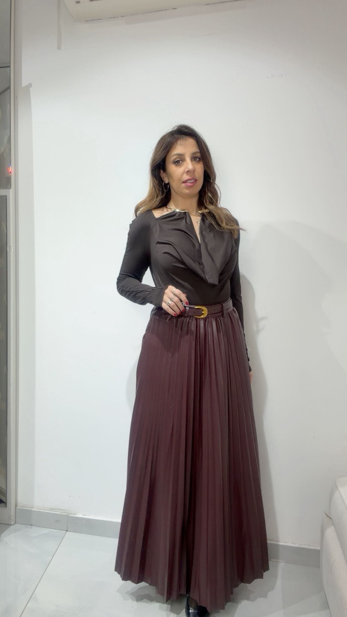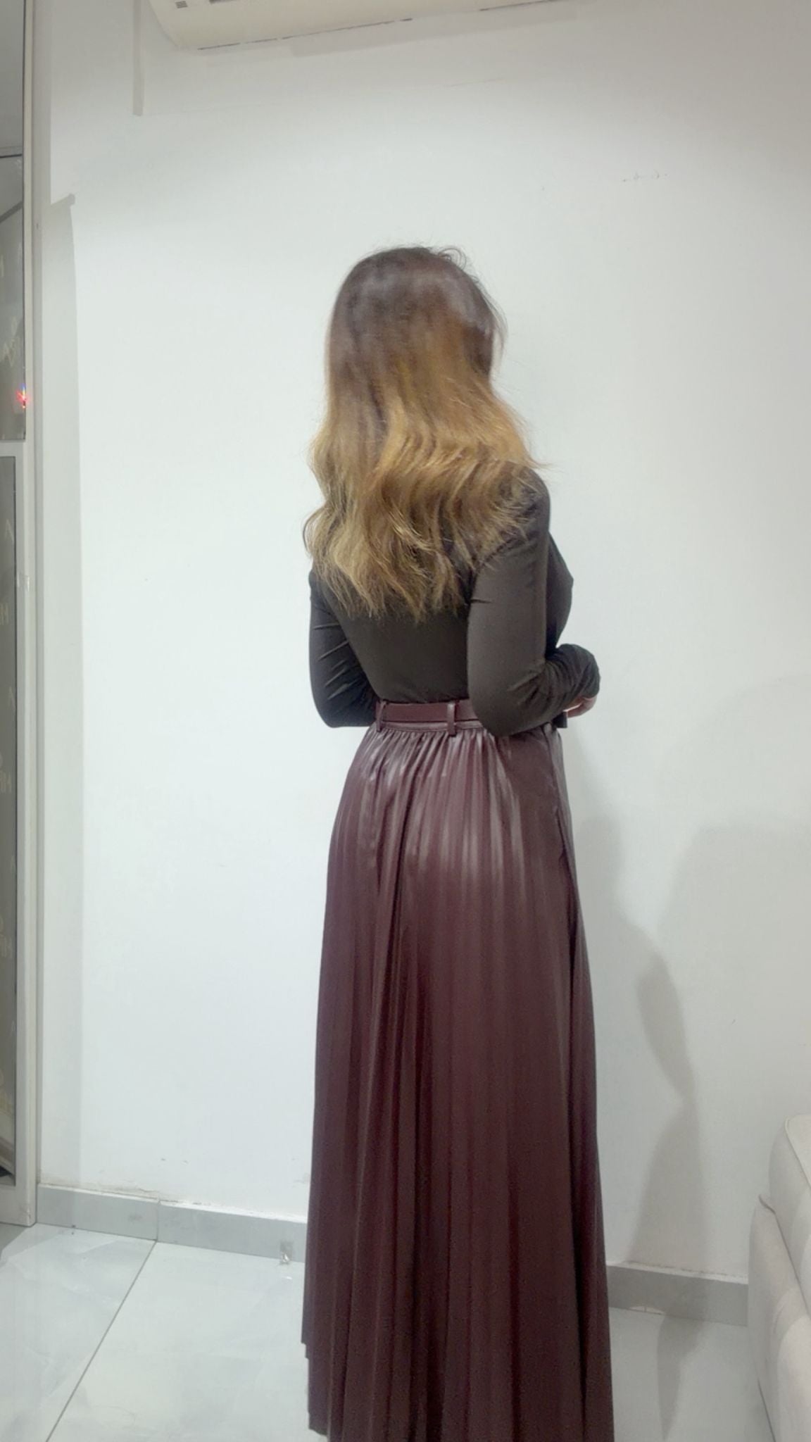 Gonna modello lungo a plissè in ecopelle, calda all'interno, vita alta con cintura, vestibilità da S a L