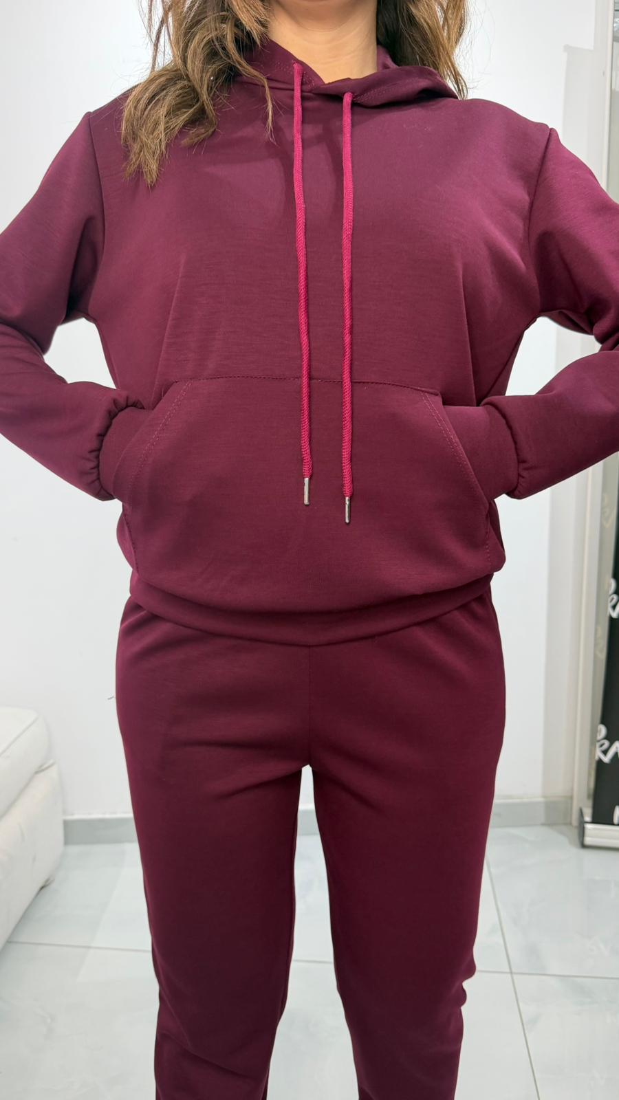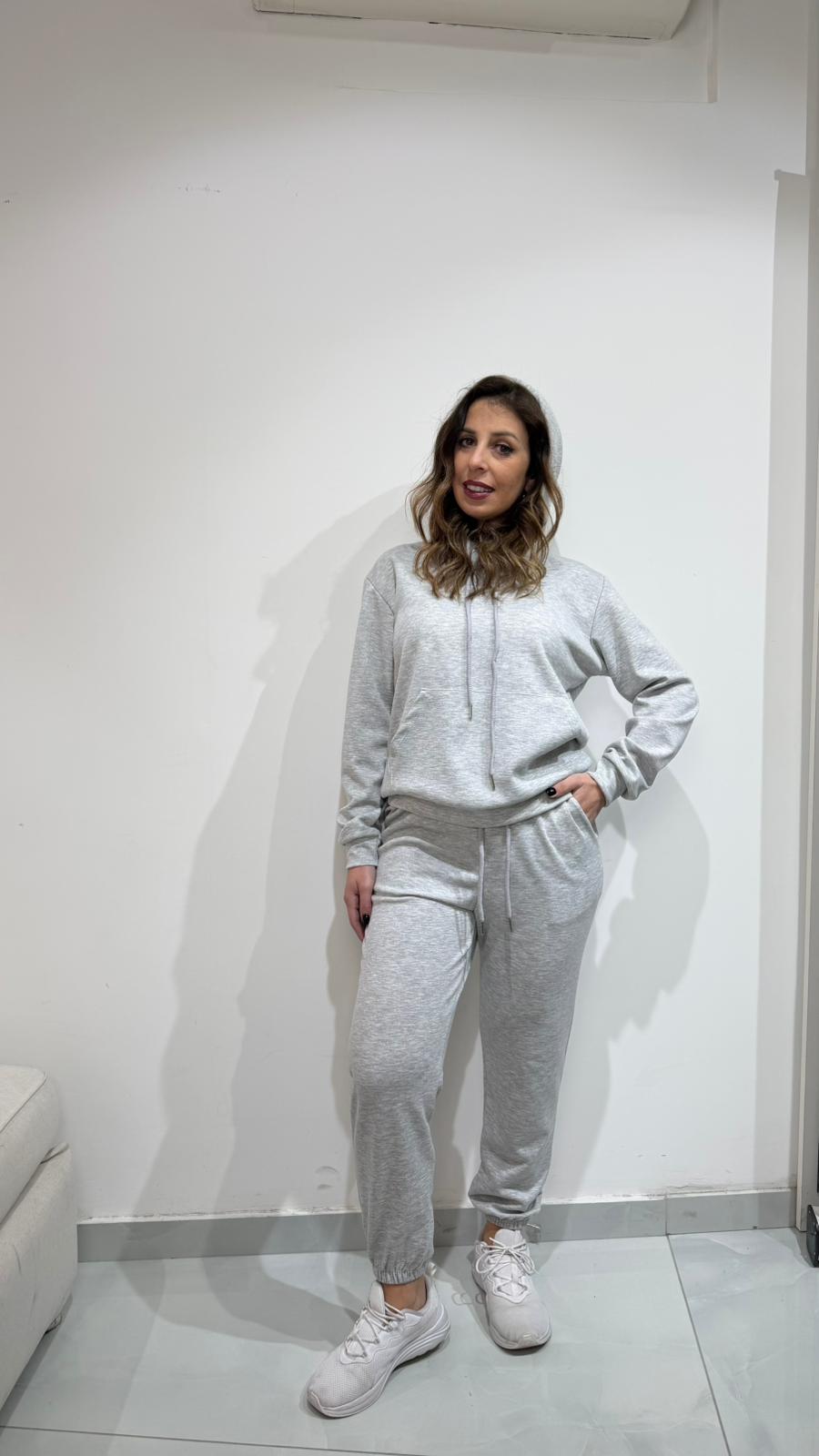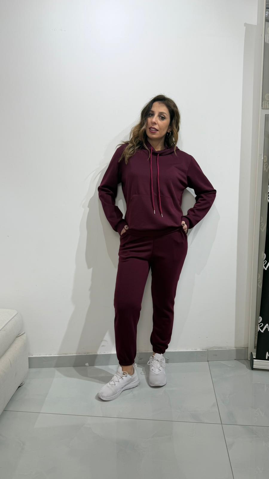 Tuta in viscosa 2 pezzi,  morbida e calda, modello oversize, unico colore composta da pantalone con elastico in vita ed elastico anche sul fondo, felpa con cappuccio, vestibilità da S a XL